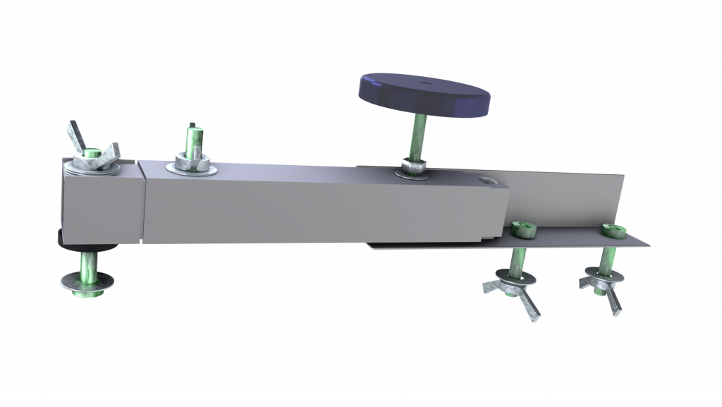 The two sections fit within one another, and are held together by a bolt fed through the slot from below and through the 5mm hole of the top section, and secured with a 5mm washer and wing nut.
