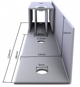 In addition to that, we use a 24mm equal angle aluminum length, and a 19mm U section, obtainable from the same area in the hardware store. Looking at the U section from the end, the 19mm section measures 16mm on the inner edge of the U section, so the thickness is 1.5mm.