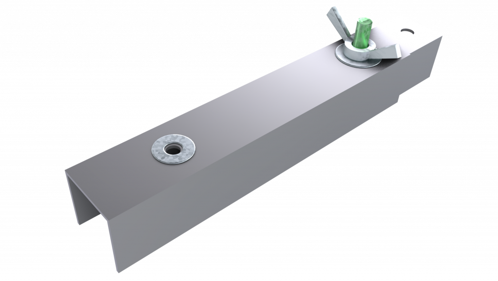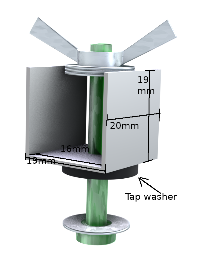 The clamp connector’s purpose is to fasten both left and right horizontal extenders to the screen clamp. This is a very simple component, consisting of a 20mm length of 19mm U aluminum edging, a tap washer, a few 5mm metal washers, a bolt and a wing nut.