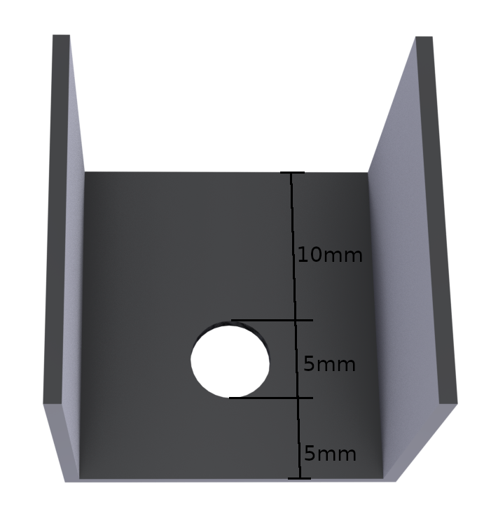 A 4mm hole is drilled through the 52x16mm U section and the top of the 10x20mm rectangular portion, 15mm from the front edge, and a nut is glued from inside the rectangular portion, using epoxy glue. It is very important that this nut be held securely in place, as this will be center of the mount point.