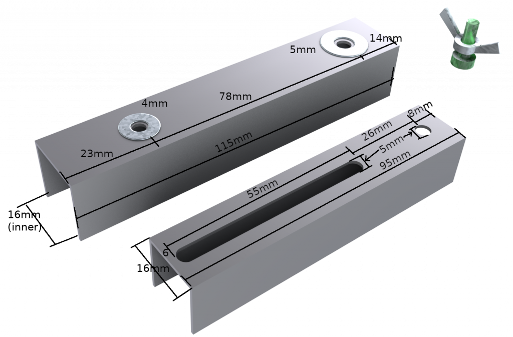 We use a 115mm section of 19mm U tube aluminum (16mm inner), and a 95mm length of the 16mm U section aluminum (Hillaldam 21A), which has a 5x55mm slot cut doen the center of the length, starting 6mm from the edge. On the other end of this piece, we drill a 5mm hole 8mm from the edge.