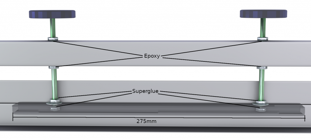 The clamping unit is driven by two long 5mm screw knobs, each of which ends in a nut. This nut is inserted from the side into a 275mm length of 10x20mm rectangular aluminum tubing, and locked into place with loctite/superglue, such that it holds the aluminum clamping bar in place and the screws are fixed.
